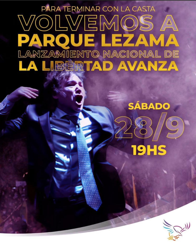 «Para terminar con la casta volvemos a Parque Lezama. Lanzamiento nacional de LLA», expresa el flyer que convoca al acto, para el sábado 28 a las 19″.