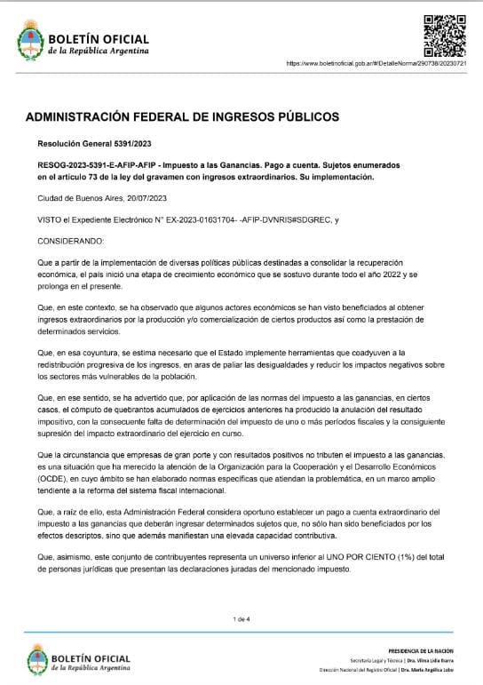 El anticipo se estableció a través de la Resolución N° 5391, publicada este viernes 21 de julio en el Boletín Oficial. La nueva reglamentación obliga a las empresas que hayan declararon una ganancia igual o superior a $ 600 millones y descontaron de ella quebrantos de ejercicios anteriores. Se excluye a las personas jurídicas que cuenten con un certificado de exención del impuesto a las Ganancias vigente.