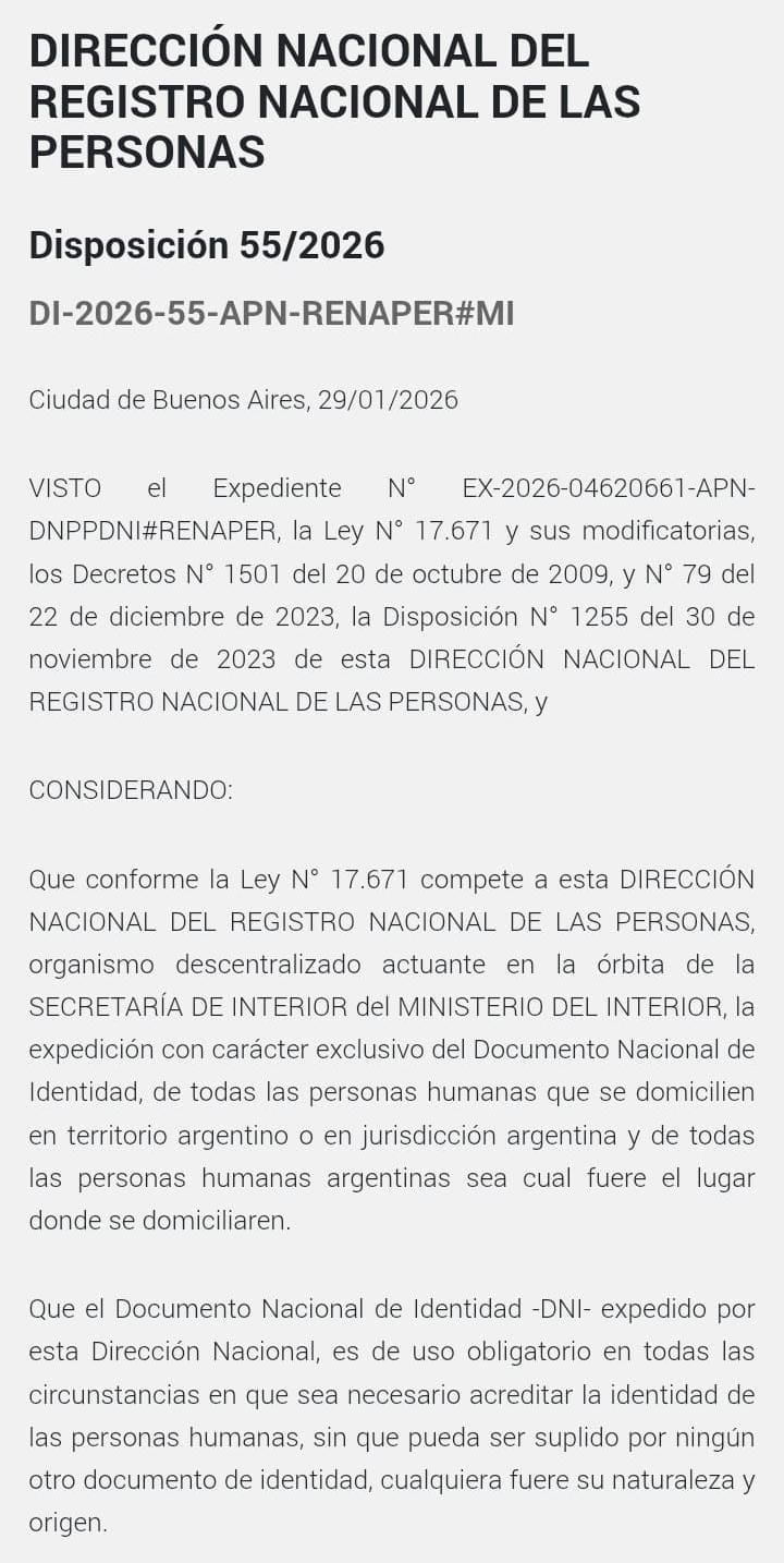 BUENOS AIRES.- En mañana de éste viernes se publicaron en el Boletín Oficial, las Disposiciones N° 54/2026 y N° 55/2026, a través de las cuales la Dirección Nacional del Registro de las Personas (DNRP), presentó un nuevo Documento Nacional de Identidad (DNI) electrónico y una serie de cambios en el pasaporte, que comenzarán a regir el 1° de febrero de 2026.