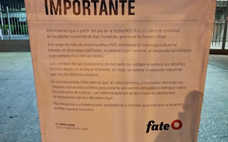 BUENOS AIRES.- En el primer día hábil de la semana, FATE S.A.I.C.I. anunció el cierre definitivo de su actividad como fabricante de neumáticos. La empresa argentina, propiedad de la familia Madanes Quintanilla y con más de ocho décadas de trayectoria, despedirá a la totalidad de sus empleados, liquidará su negocio y clausurará su planta industrial de la localidad de Virreyes, en el partido bonaerense de San Fernando.