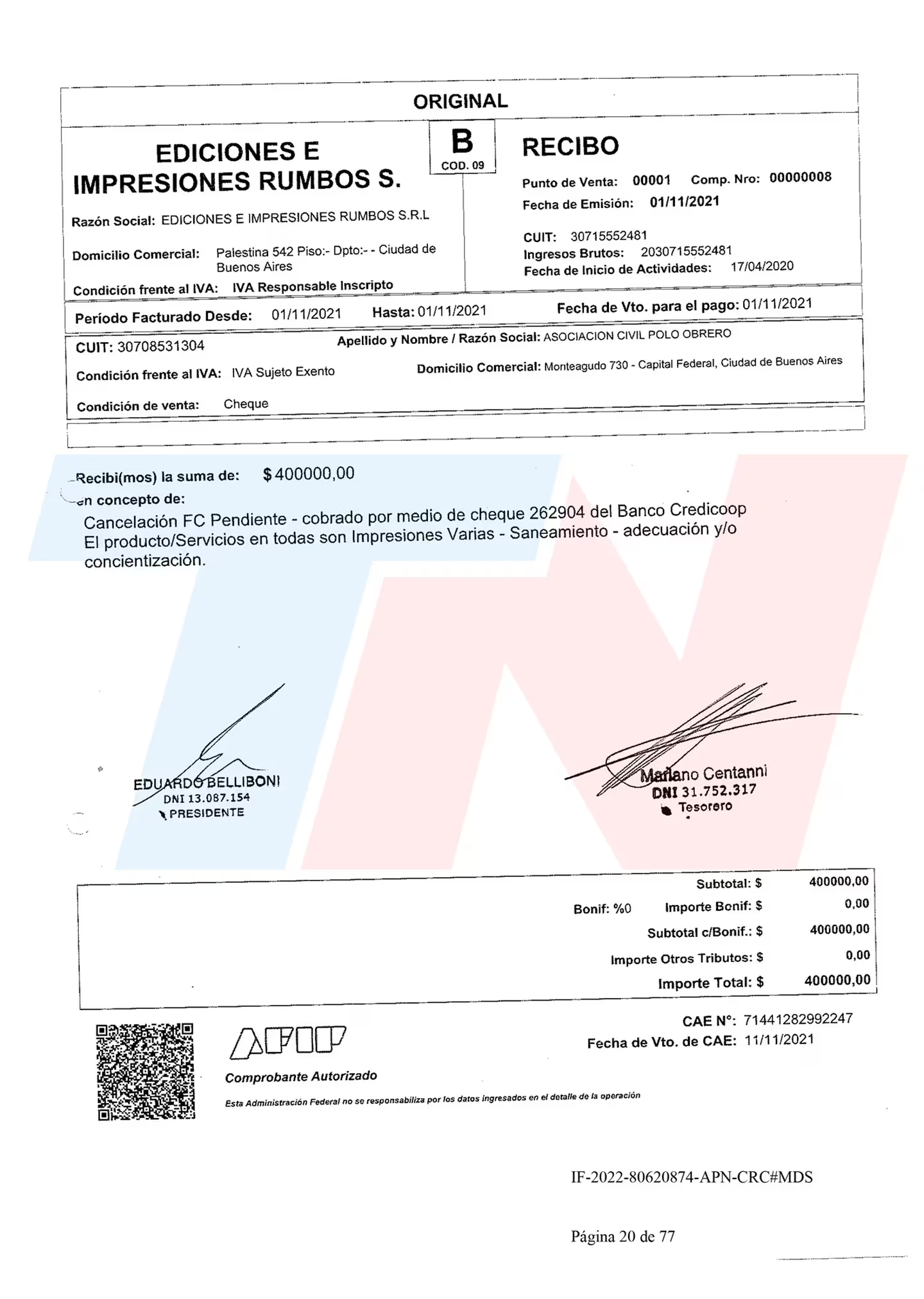 Son facturas emitidas por la imprenta Rumbos, por un total de $20 millones al espacio liderado por Eduardo Belliboni.