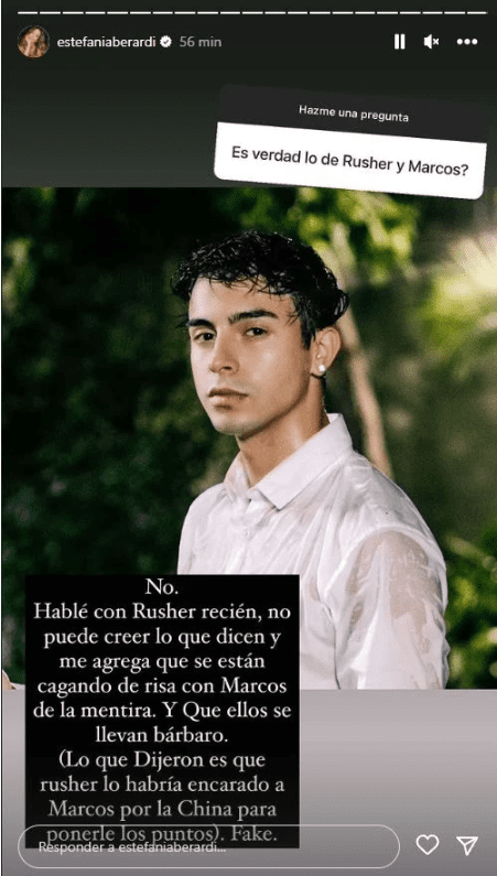 Lo cierto es que, de acuerdo a Estefi Berardi, Rusherking desmiente totalmente que ocurrió una pelea. “Hablé con Rusher recién, no puede creer lo que dicen y me agrega que se están riendo con Marcos de la mentira. Y que ellos se llevan bárbaro”, dijo la panelista en sus historias de Instagram.