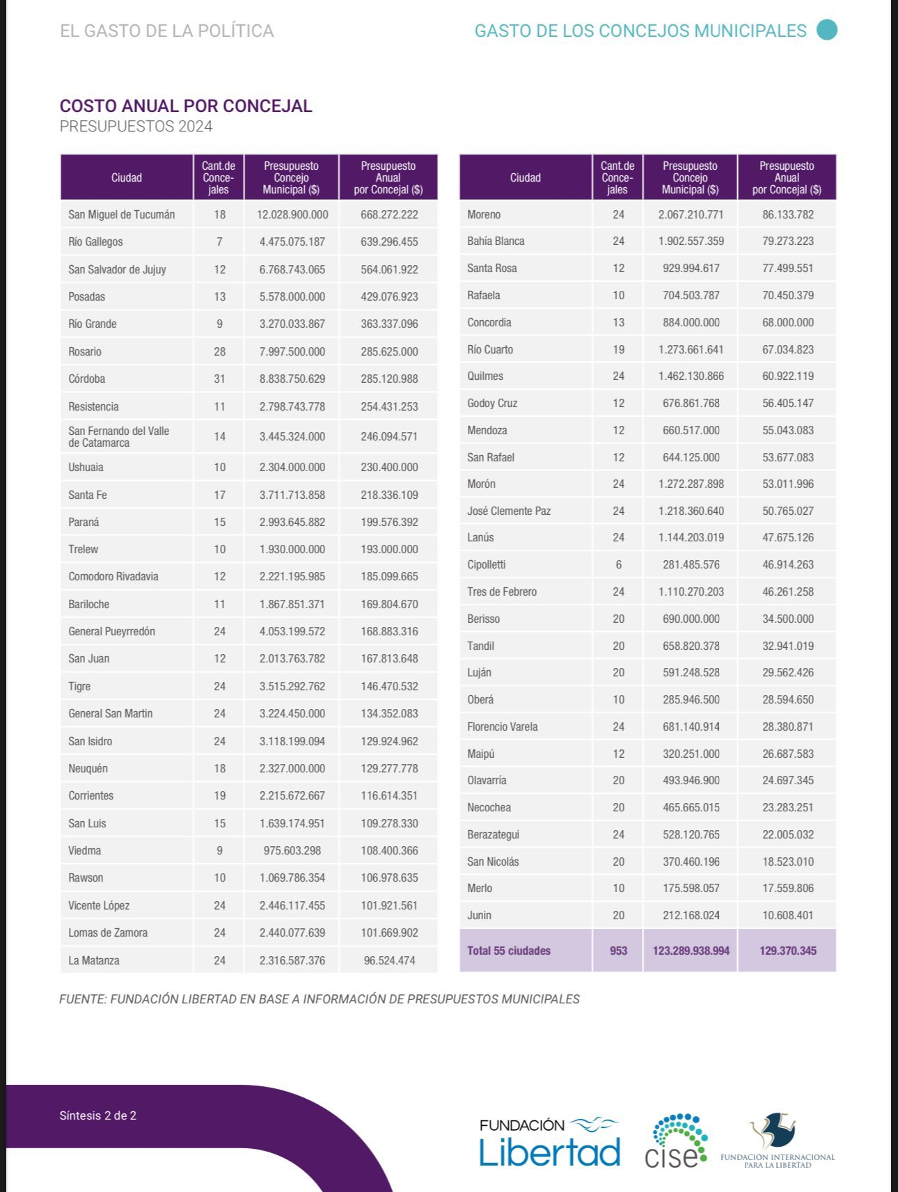 SANTA FE.- El viernes pasado la Fundación Libertad presentó a través de sus redes sociales, un informe donde expuso los costosos gastos de los concejos deliberantes de Argentina.