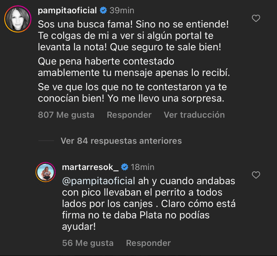 La pelea no quedó ahí porque luego la influencer subió a su perfil una noticia sobre el escándalo. Nuevamente Pampita contestó con furia al posteo: “Ahí tenes tus notas en los portales a costa mía! Te salió bien la estrategia”. La modelo explicó que no firma causas que no estén bajo su cuidado y no sean transparentes. “No se quien se va a animar a hacer algo con vos, con lo agresiva que sos!Mostraste la hilacha hablando así de otra mujer! Ojalá a esos animales los cuide alguien con un buen corazón y no vos!” concluyó.
