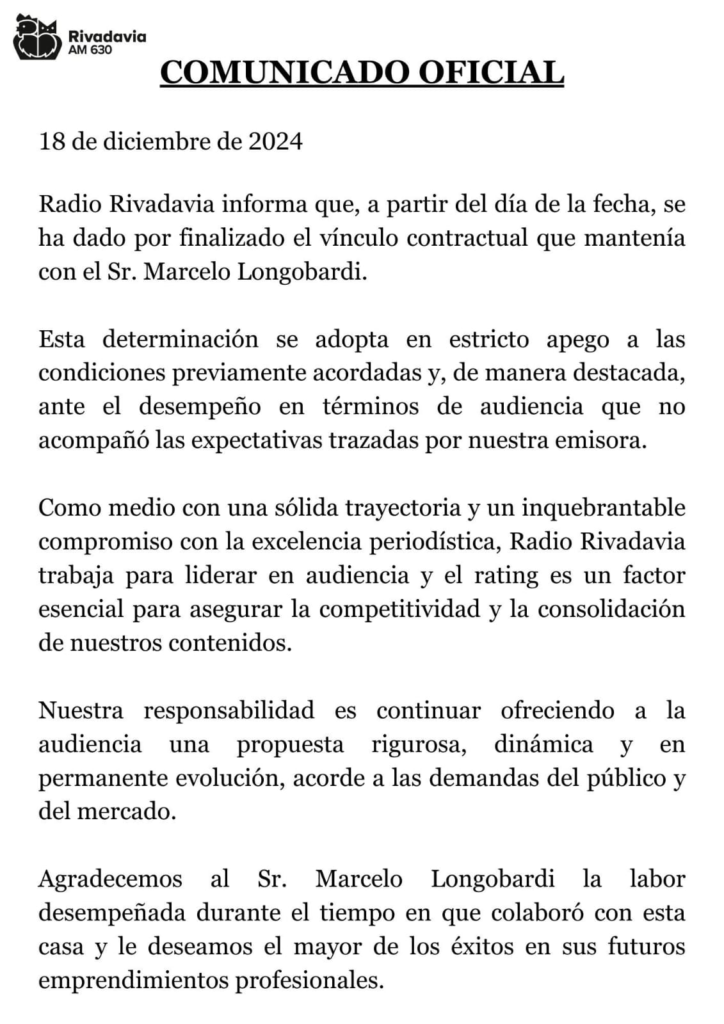 Jonatan Andreani, director de Rivadavia, declaró: “El programa pierde solidez cuando el periodista analiza la realidad argentina desde Miami. Además, no superó las expectativas en términos de audiencia”. Andreani también destacó que Longobardi trabajaba desde el exterior o desde Nordelta y que la desconexión con su equipo era evidente. A su vez, confirmó que otros miembros del programa continuarán en la radio, mientras que la columnista Maite Peñoñori también fue desvinculada por trabajar desde Miami.