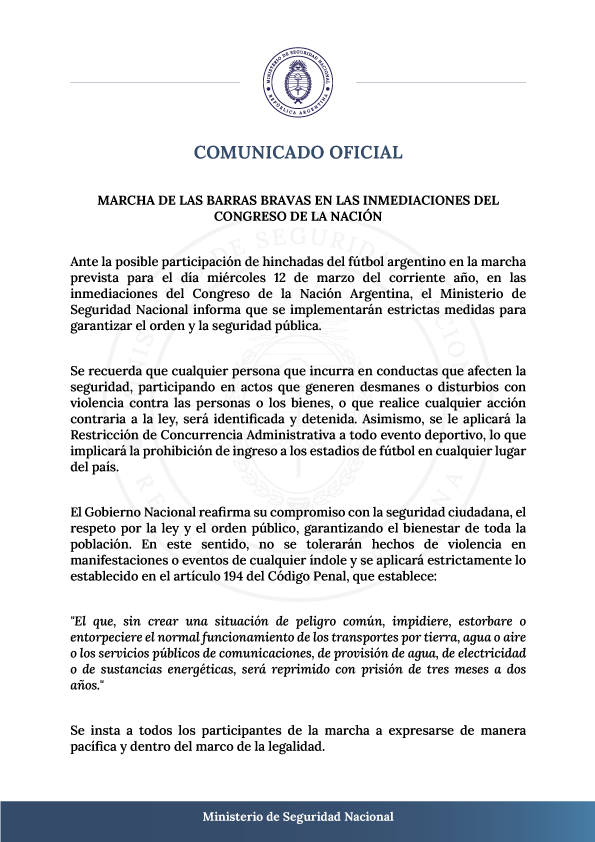 BUENOS AIRES.- En la tarde de ayer el Ministerio de Seguridad de la Nación, emitió un comunicado en el que advirtió que aplicará fuertes sanciones, a los hinchas que provoquen incidentes en la marcha de jubilados.