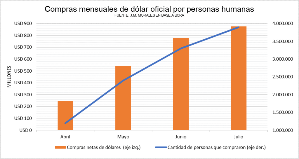 ¿A qué se deben estas nuevas restricciones? Básicamente tienen que ver con que en los últimos meses la demanda de dólar oficial creció exponencialmente por parte de las personas humanas. Mientras que abril un poco más de un millón de personas compraron dólar oficial por un total de U$D248 millones, en el mes de julio la cantidad de personas que lo demandaron ascendió a casi 4 millones y lo hicieron por un total de U$D876, es decir que en julio 2.700.000 personas nuevas se sumaron a la demanda de dólares respecto a abril y lo hicieron por un monto 3,5 veces superior.