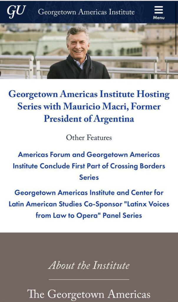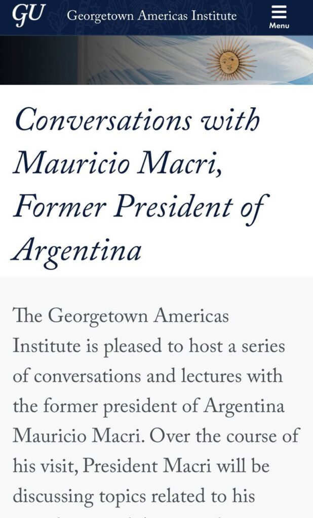 Las conferencias son organizadas por el Georgetown Americas Institute de esa casa de estudios, que programó para hoy una conferencia de Macri bajo el título «Reflexiones sobre liderazgo«, mientras que la charla de mañana se convocó bajo la consigna «Lecciones de una Presidencia«.