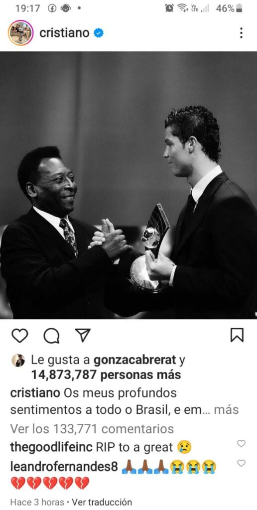“Mi más sentido pésame para todo Brasil, y en particular para la familia del Sr. Edson Arantes do Nascimento. Un mero “adiós” al eterno Rey Pelé nunca será suficiente para expresar el dolor que actualmente embarga a todo el mundo del fútbol. Una inspiración para tantos millones, una referencia de ayer, de hoy, de siempre”, expresó Cristiano Ronaldo por Instagram.