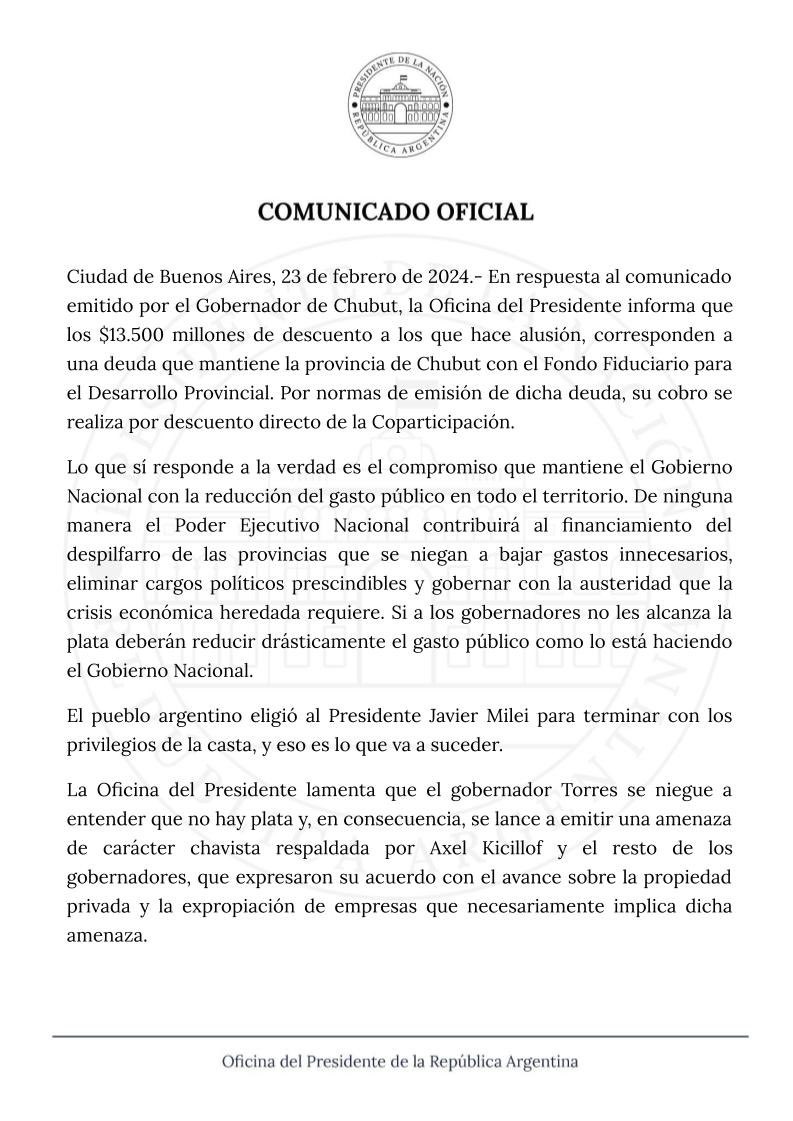 La respuesta no se hizo esperar y a través de un comunicado posteado en la cuenta de X, de la Oficina del Presidente, advirtió que esos fondos corresponden a “una deuda que mantiene la provincia de Chubut con el Fondo Fiduciario para el Desarrollo Provincial”. En ese sentido, explicaron que el cobro de dicha deuda “se realiza por descuento directo de la Coparticipación”.