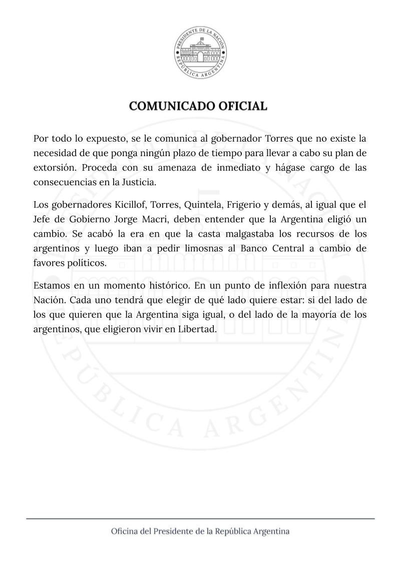 “Por todo lo expuesto, se le comunica al gobernador Torres que no existe la necesidad de que ponga ningún plazo de tiempo para llevar a cabo su plan de extorsión. Proceda con su amenaza de inmediato y hágase cargo de las consecuencias en la Justicia”, expresa en forma contundente el Gobierno.