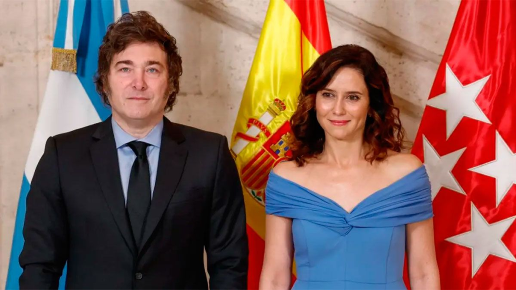 Díaz Ayuso destacó al entregarle la distinción a Milei: “Es un inmenso honor recibirte, nos produce una inmensa alegría justo ahora, cuando la Nación Argentina está resurgiendo con fuerza y se habla de ella por todas partes”.