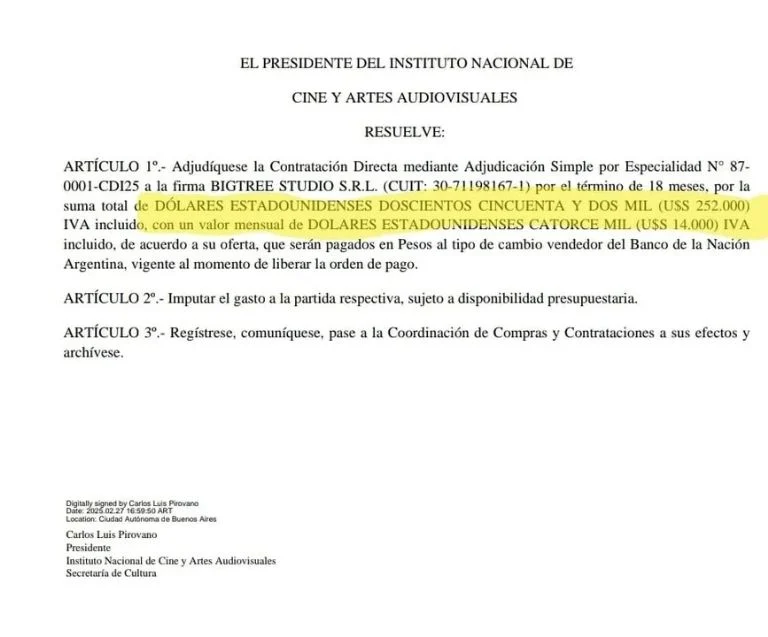 Trascendió que el organismo contrató a la firma BIGTREE STUDIO S.R.L. para el desarrollo y mantenimiento de la plataforma digital INCAA EN LÍNEA, con un presupuesto de U$S 252.000, cifra equivalente a más de $ 250.000.000.