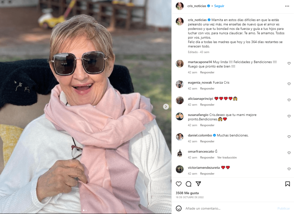 La ausencia de Cristina en la cobertura periodística de las P.A.S.O levantó sospechas, pero finalmente se confirmó el motivo. En diálogo con Teleshow, la periodista de Telefe Noticias habló del duro momento que atraviesa. “Les agradezco la preocupación por esta noticia tan personal. Lo único que puedo decir es que mi madre nos dejó un ejemplo inmenso de amor y de lucha hasta el final, y que nos tuvo a su lado peleando con ella. Solo queremos honrarla siguiendo su ejemplo porque mi mamá era una santa” expresó.
