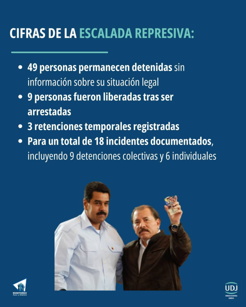 NICARAGUA.- En la jornada de ayer la Organización No Gubernamental (ONG) El Monitoreo Azul y Blanco, emitió un informe en su cuenta de la red social Facebook, donde indica que registró al menos 60 detenciones arbitrarias en Nicaragua, luego de la captura del dictador venezolano Nicolás Maduro.