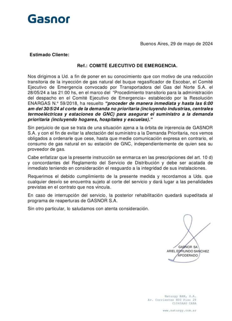 BUENOS AIRES.- Por medio de un comunicado de prensa, la empresa Gasnor informó la entrada en vigencia de una medida de emergencia, debido a «una reducción transitoria en la inyección de gas natural proveniente del buque regasificador en Escobar» por lo que el Comité Ejecutivo de Emergencia, resolvió cortar inmediatamente la demanda de gas no prioritaria para asegurar el suministro a la demanda prioritaria.