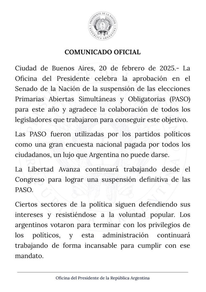 BUENOS AIRES.- En la tarde del jueves luego de un intenso debate, la Cámara de Senadores de la Nación, suspendió las elecciones Primarias Abiertas Simultaneas y Obligatorias (PASO) 2025.