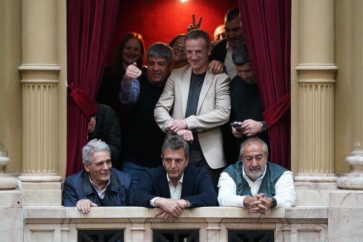 Acompañando a Massa en el palco, estaban otros líderes de la Confederación General del Trabajo (CGT): Jorge Sola, titular del Sindicato del Seguro, Héctor Daer de Sanidad y Carlos Acuña de los trabajores de estaciones de servicio.