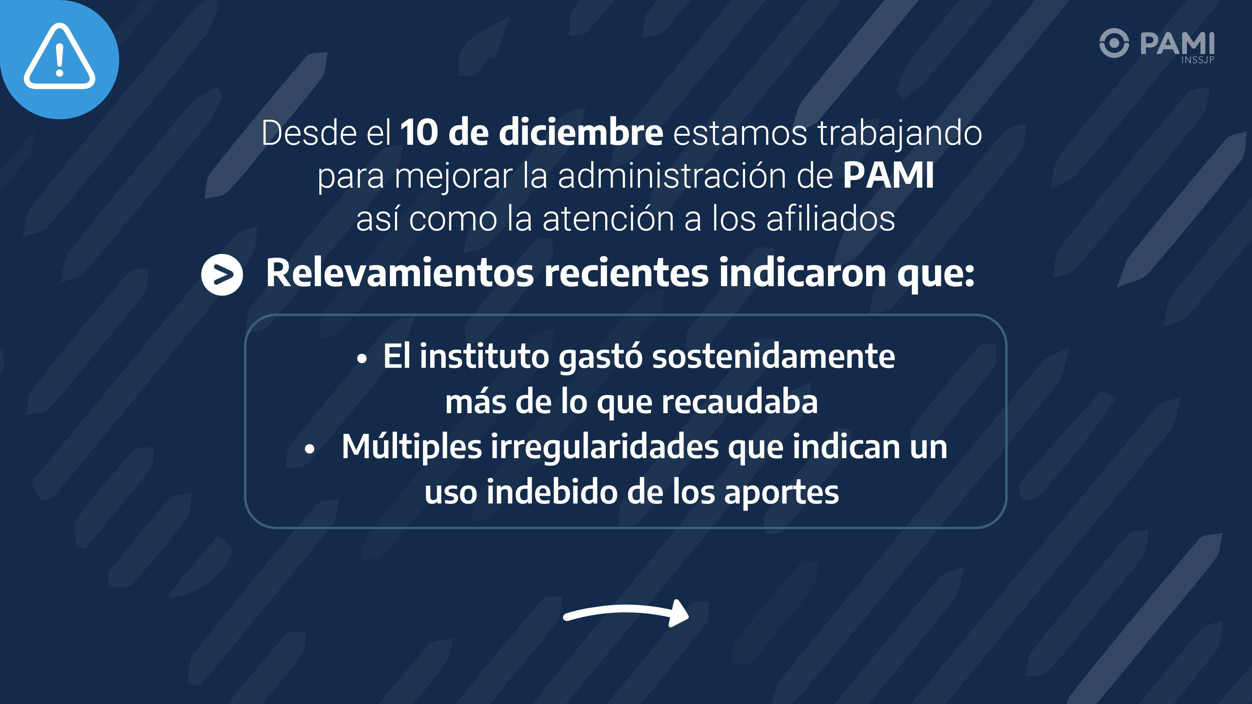 “Los datos iniciales indican que, de no haberse tomado las medidas inmediatas que puso en marcha la nueva gestión, el PAMI habría entrado en una debacle financiera y estarían en riesgo las prestaciones que el Instituto brinda a sus Afiliados. Desde hace varios meses que PAMI tiene balance presupuestario negativo, pero ha ido saldando ese déficit con ahorros”, indicó.