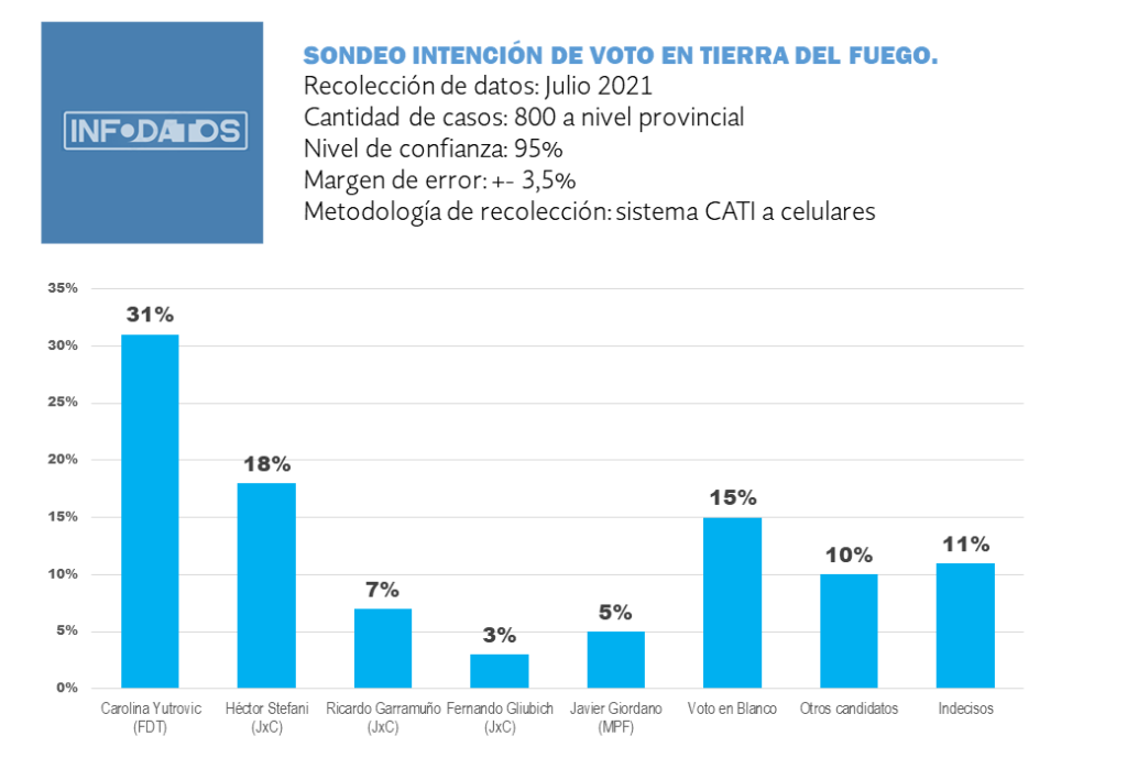 La encuestadora INFODATOS hizo público un sondeo realizado en Tierra del Fuego para las elecciones primarias, donde el Frente de Todos obtendría un porcentaje similar al de las elecciones de 2017. En segundo lugar estaría el candidato de Juntos por el Cambio, Héctor Stefani. Las elecciones serán en menos de 60 días.
