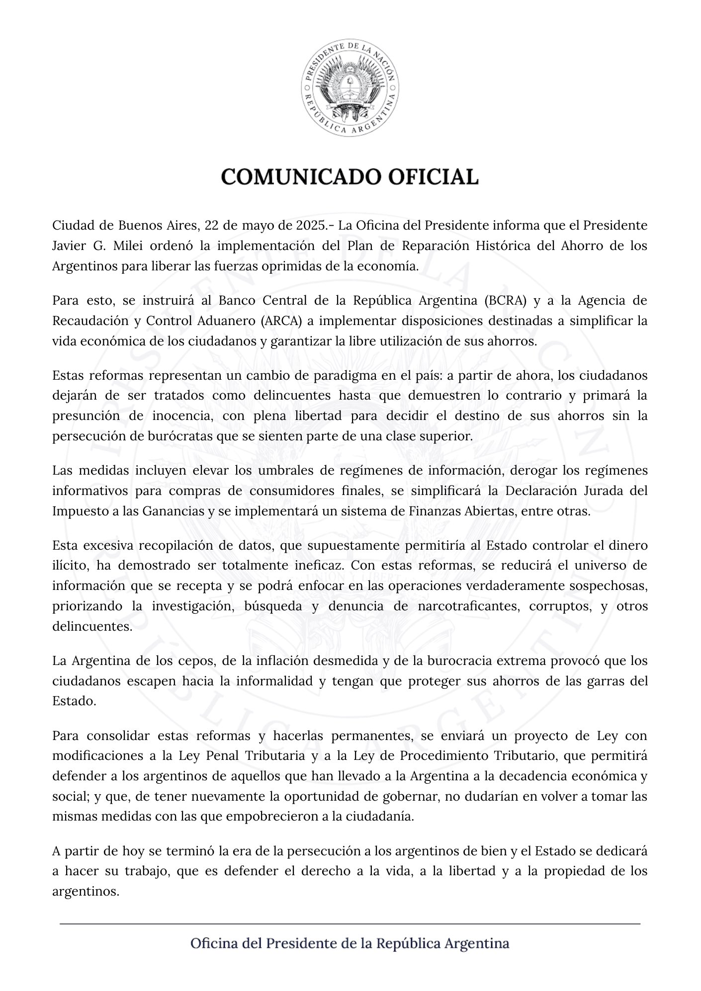 «Normalizamos prácticas ridículas como que el Estado obliga a los bancos a informar todas las extracciones de efectivo que se hicieron y obliga a los comercios a informar compras de cualquier tipo», destacó el portavoz.