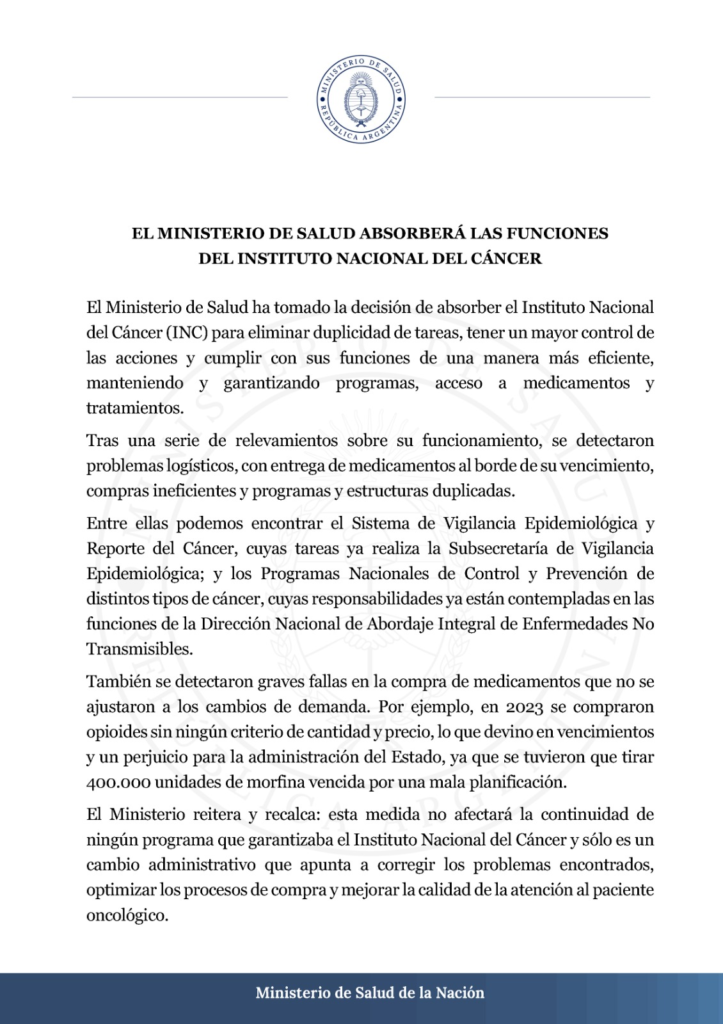 BUENOS AIRES.- En la tarde del jueves el Ministerio de Salud de la Nación (MSN) a través de su cuenta en la red social X, comunicó que el Instituto Nacional del Cáncer (INC) dejará de existir como entidad autónoma y será absorbido por el ministerio que encabeza Mario Lugones.