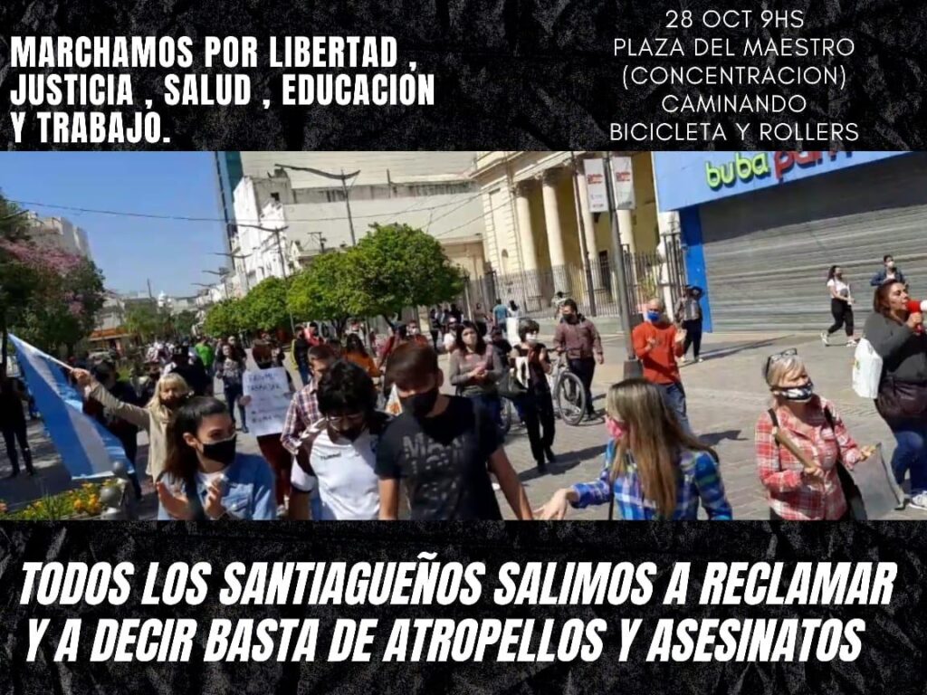Desde hace mas de un mes y medio cada miércoles los santiagueños se movilizan. La marcha de esta semana contará con un importante número de manifestantes todos unidos en un mismo puño, saldrán juntos a combatir los atropellos de los cuales fueron víctimas reclamando libertad, justicia, salud, educación y trabajo. –