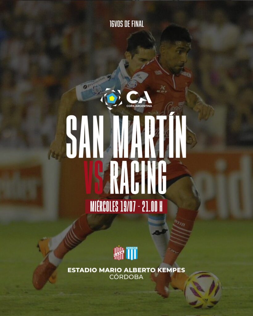 Por los 16avos de final de la Copa Argentina, San Martín de Tucumán y Racing se enfrentan a partir de las 21 en el Estadio Mario Alberto Kempes, Córdoba. Pablo Echavarría será el árbitro y el encuentro será televisado por TyC Sports.