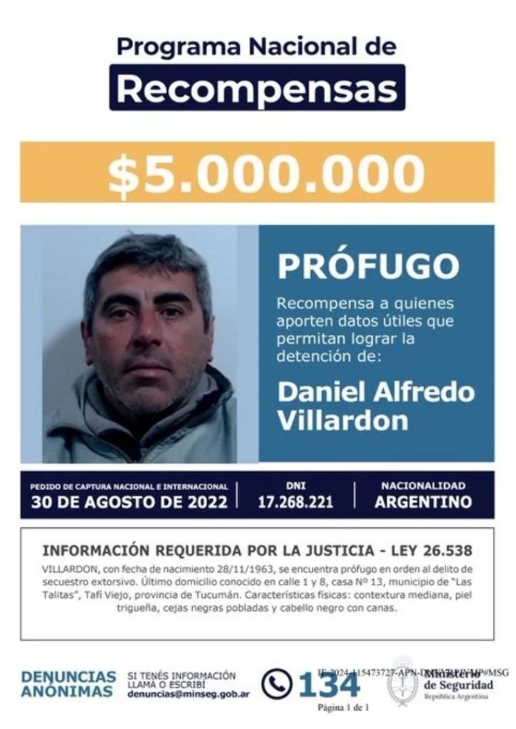 TUCUMÁN.- El Ministerio de Seguridad de la Nación estableció una recompensa de $ 5.000.000 para quienes proporcionen información útil sobre el paradero de Daniel Alfredo Villardon de 61 años, un ex-policía de la provincia de Tucumán. Actualmente, Villardon está prófugo de la justicia y es acusado de secuestros extorsivos y robo, entre otras acusaciones.