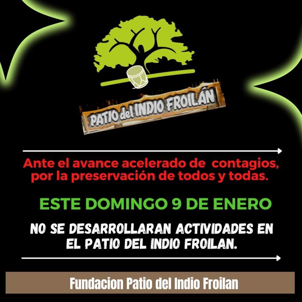 Una mala noticia tomó estado público en la mañana de hoy, la Fundación «Patio del Indio Froilán» informó a través de sus redes sociales que «ante el avance acelerado de contagios, por la preservación de todos y todas, este domingo 9 de enero no se desarrollarán actividades».