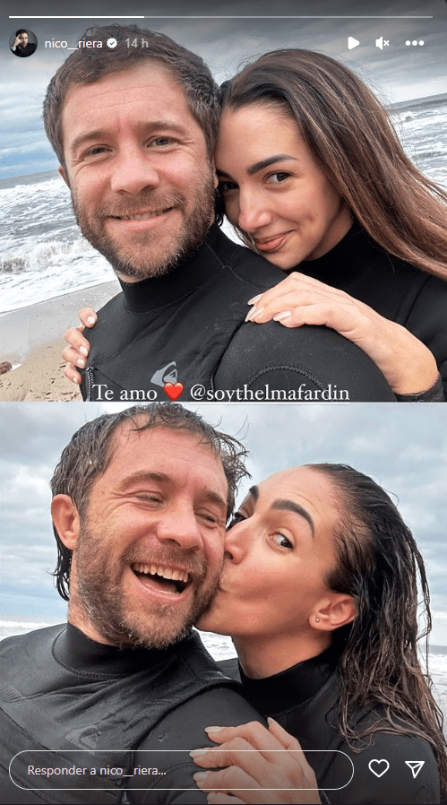En unas tiernas postales de la pareja en la playa, Nico escribió “Te amo Thelma Fardin”. Hace unos días habían comenzado a surgir los rumores de romance luego de que el actor comentará una foto de la actriz con emoji de corazones.