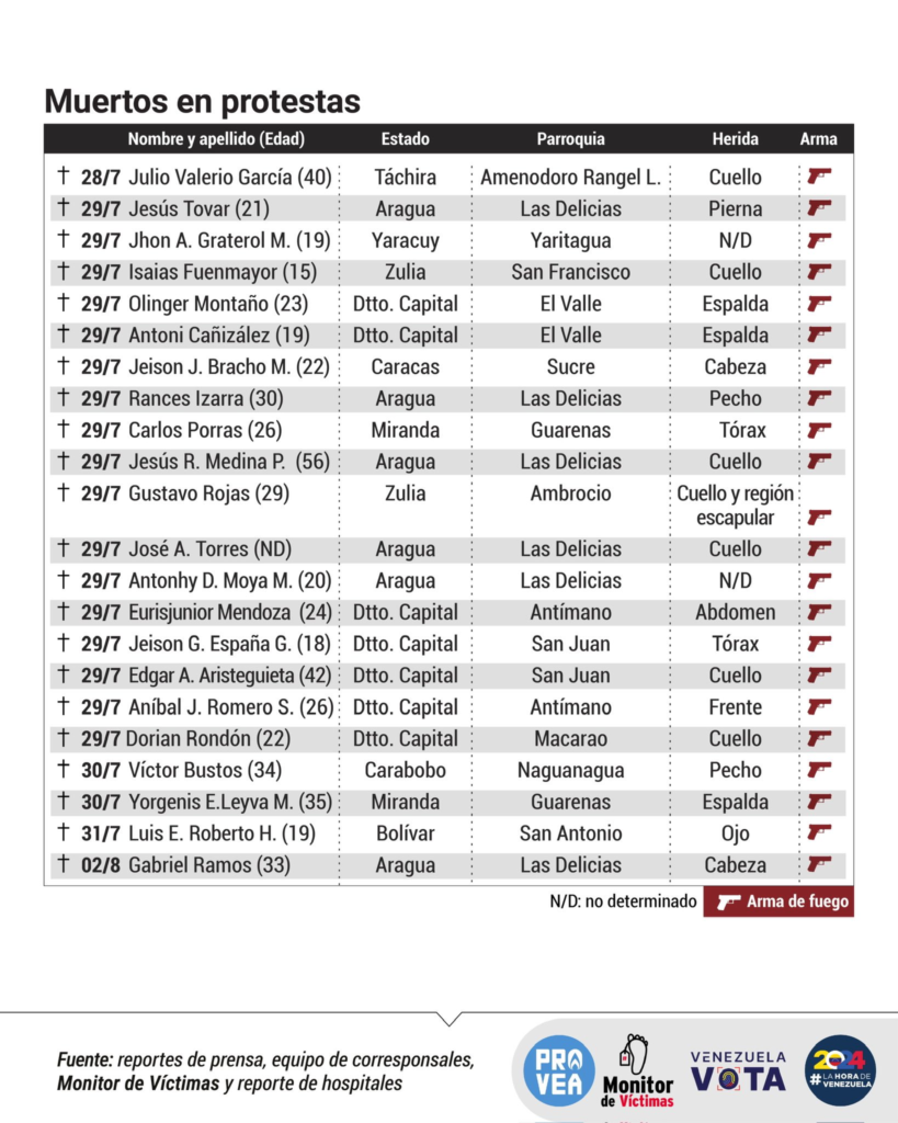 Le sigue el estado Aragua, con 6 (seis) muertes, Zulia y Miranda (2), Yaracuy, Táchira, Carabobo y Bolívar también aparecen en la lista de la organización con un fallecido, según una nota publicada por Runrunes.