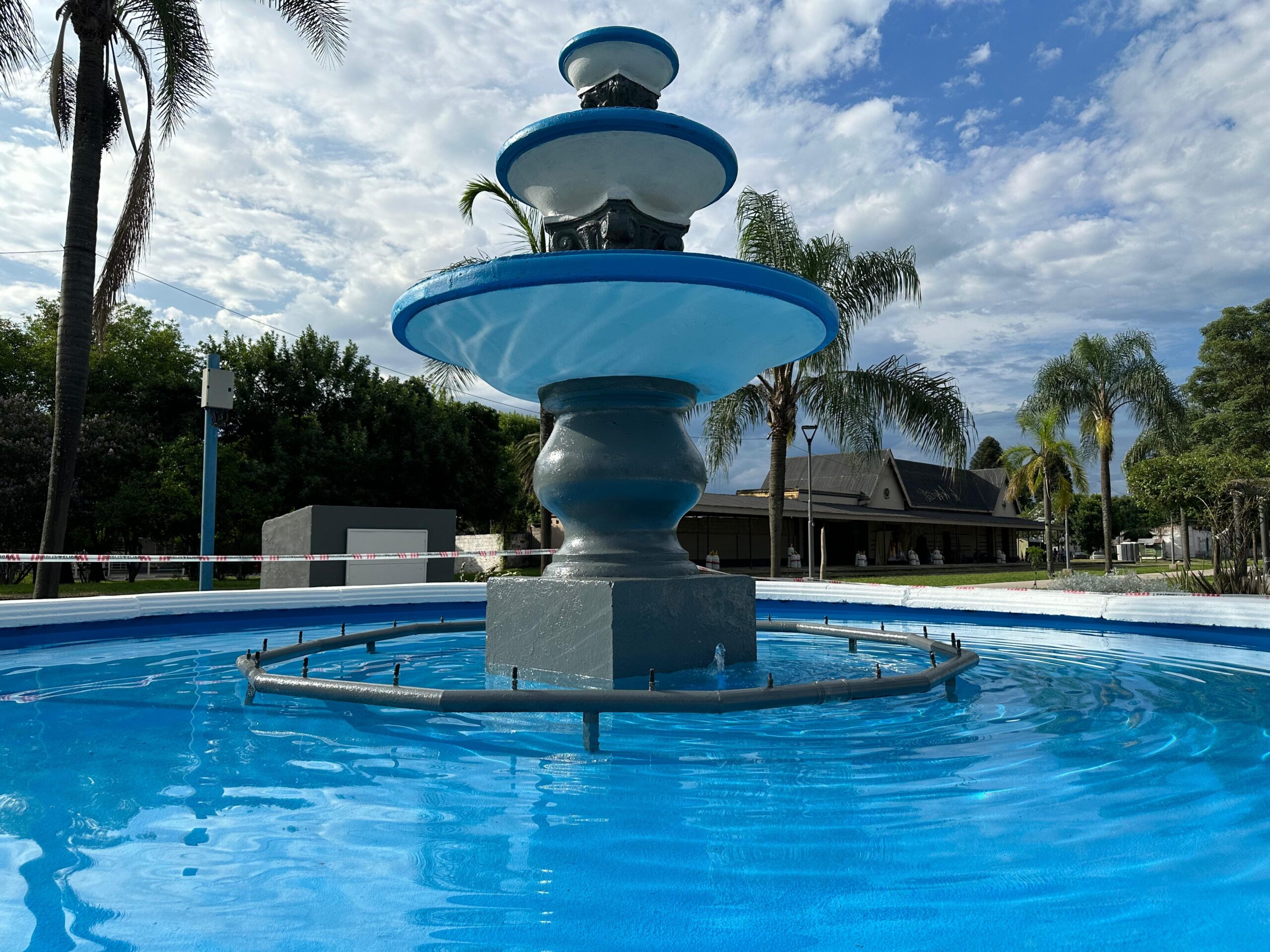 Cuando se resolvieron los problemas, y luego de las pruebas de rigor, el concejal Abraham y su equipo lijaron y repintaron la fuente de celeste y blanco.